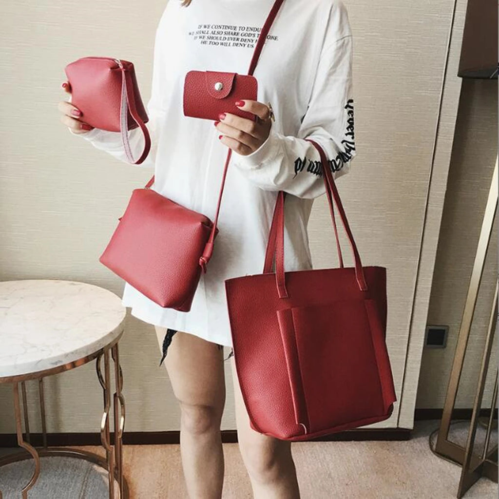 - 4-piece set includes handbag, shoulder bag, tote bag, and crossbody wallet