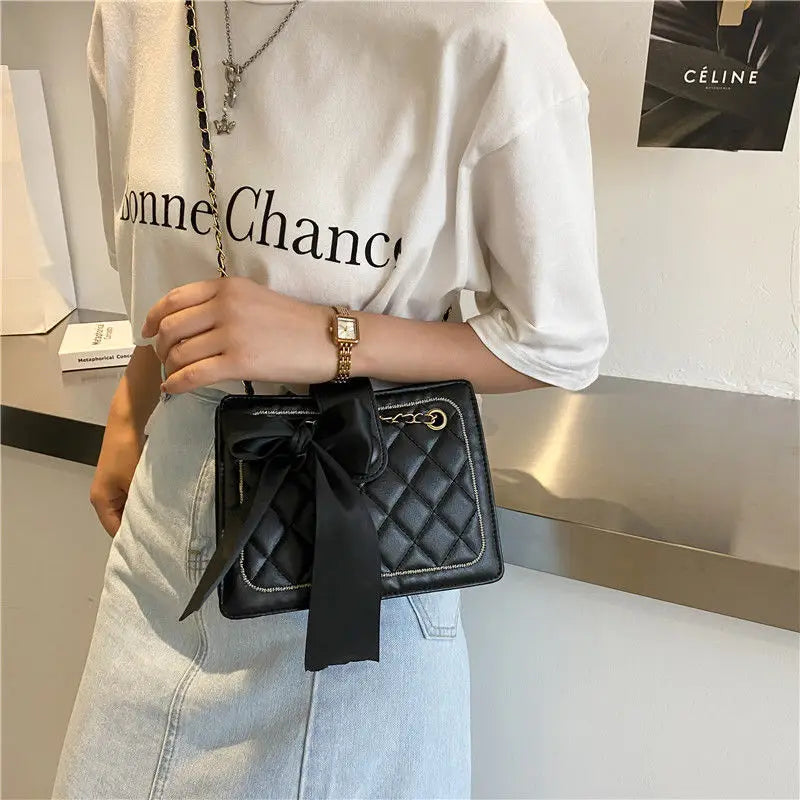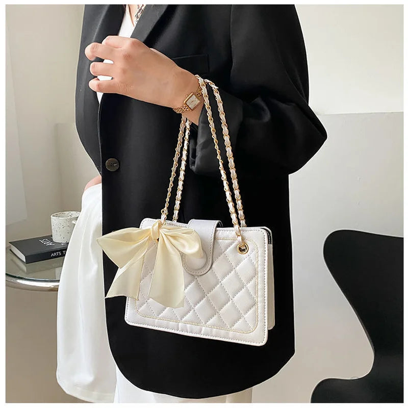 Women Bow Silk Scarf Crossbody Bags Solid Diamond Lattice Shoulder Bag