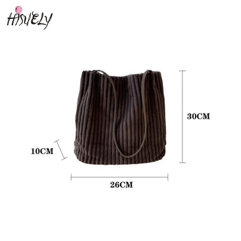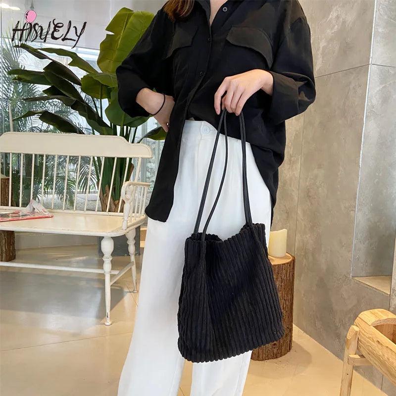 This stylish women's bucket bag is crafted from pleated retro corduroy material. It features a magnetic buckle closure and is perfect for shopping or everyday use.