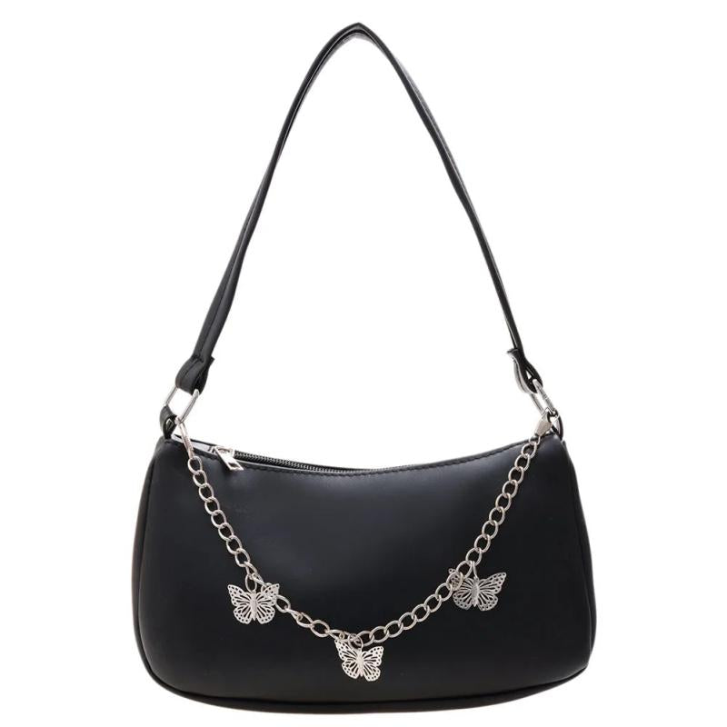 This stylish handbag features a butterfly chain shoulder strap and is made of high-quality PU leather. It's perfect for carrying your essentials in style.