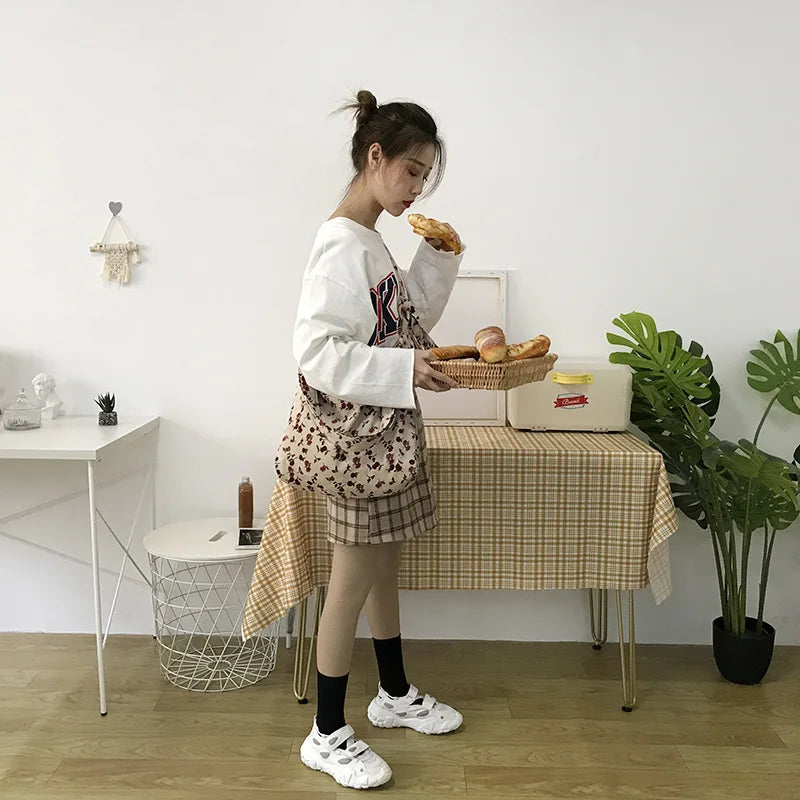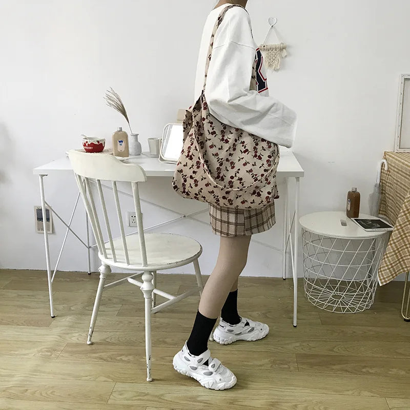 This women's shoulder tote bag is made of soft canvas fabric with a fluffy floral design. It has a large capacity and is perfect for shopping, school, or everyday use.