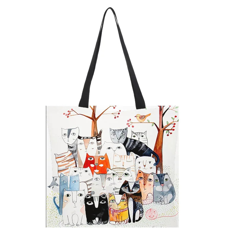 Women Cartoon Cat Handbag Cotton Linen Shopping Bag Large Capacity Shoulder Bag