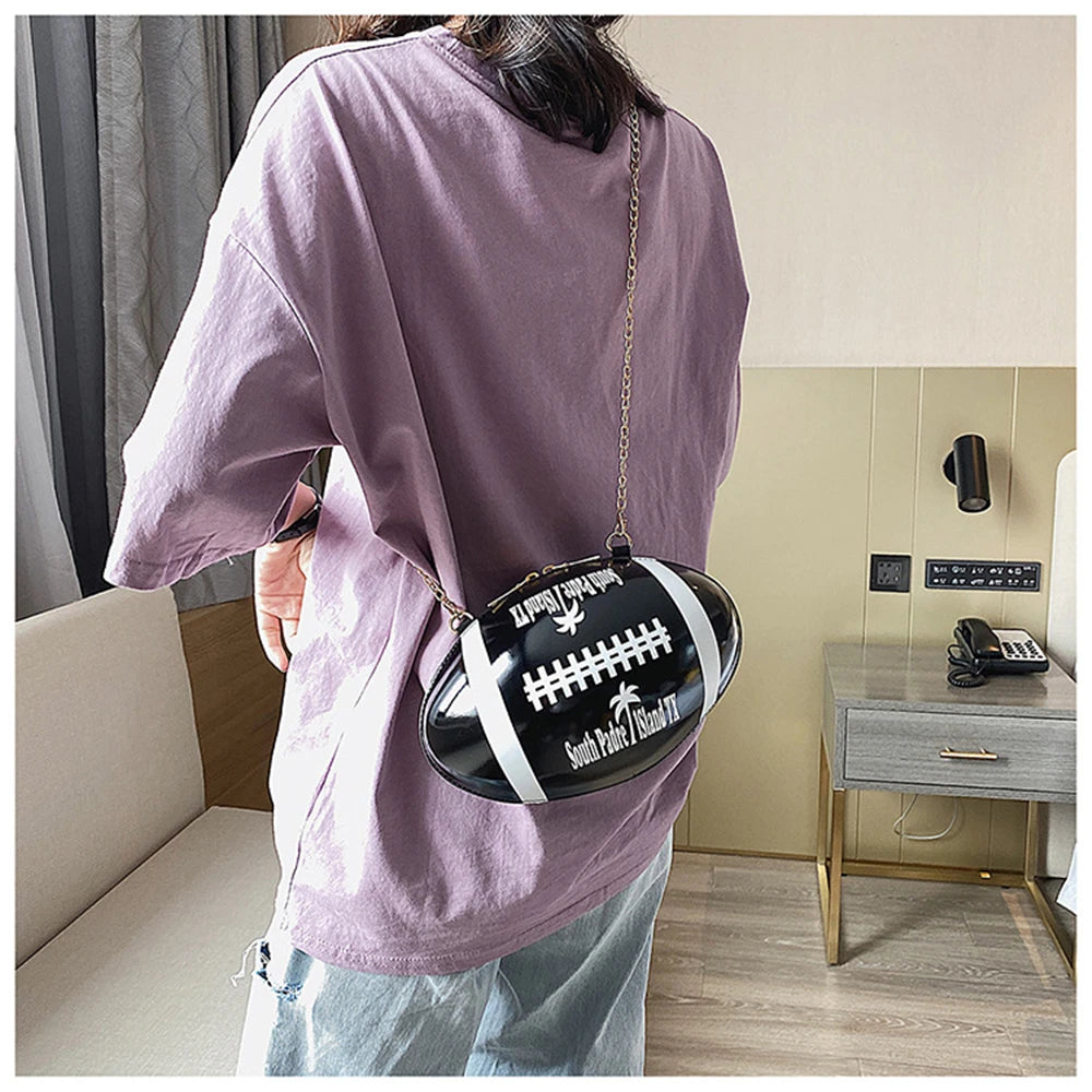 This stylish handbag features a rugby shape design with a chain shoulder strap, perfect for adding a touch of personality to your outfit.