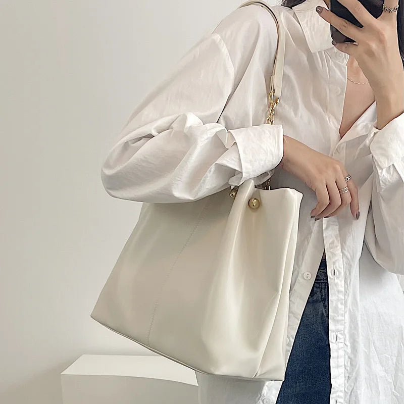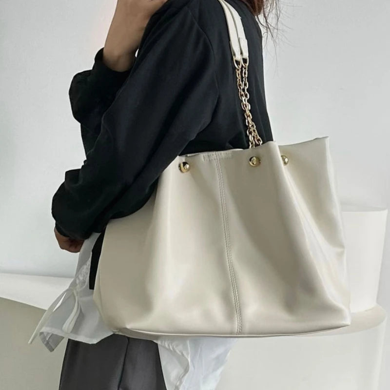 This stylish and practical women's shoulder bag is made of high-quality PU leather. It features a chain shoulder strap and a top handle. The bag is spacious and perfect for everyday use.