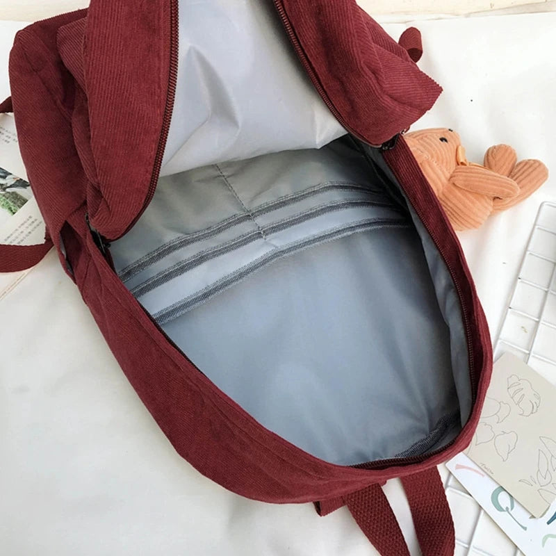 Women Corduroy Backpack with Pendant School Bag Travel College Daypack