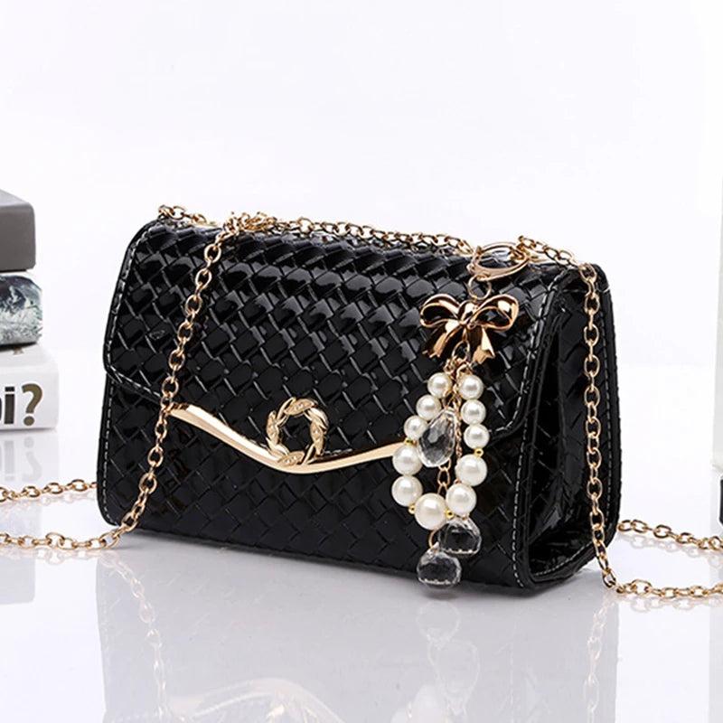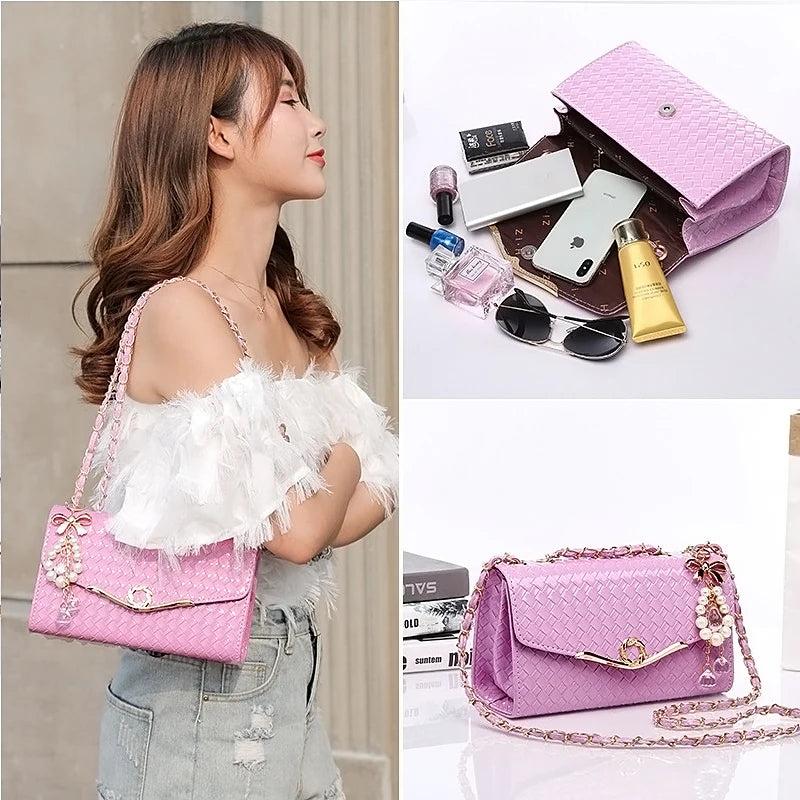 Elegant and stylish bag designed for women, featuring a diamond chain strap and a compact square shape.