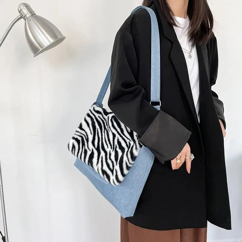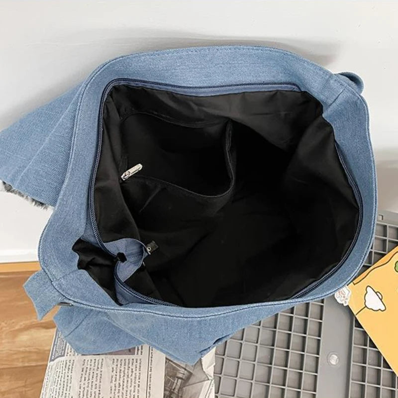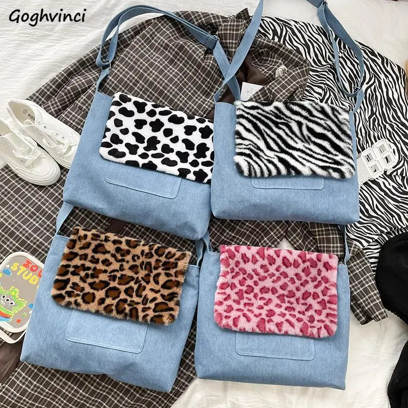 This stylish denim shoulder bag features a Harajuku-inspired design with a leopard print pattern. It is perfect for students and college-goers with its large capacity and convenient zipper closure.