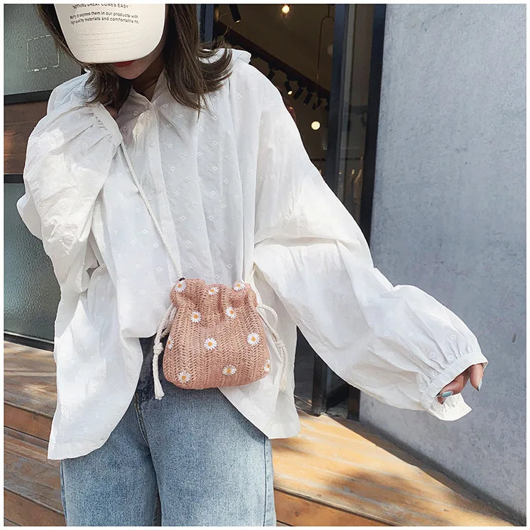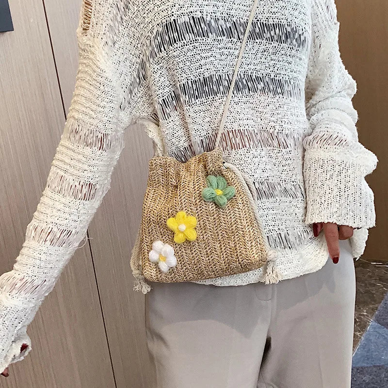 Stay stylish this summer with this beautiful flower shoulder crossbody bag. Perfect for beach days or casual outings, this woven drawstring straw purse is both fashionable and practical. Carry your essentials in style!