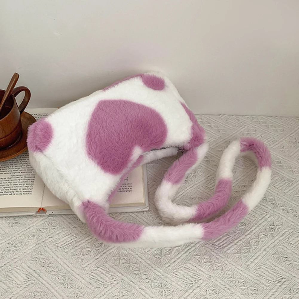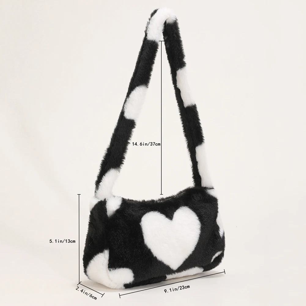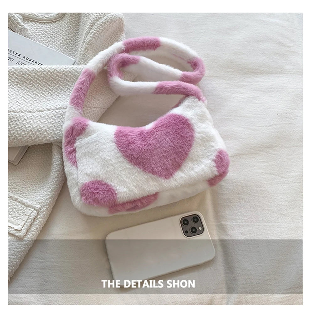 Stay stylish and cozy with this heart-printed shoulder bag featuring warm plush material. Perfect for autumn and winter seasons, this tote is a chic and practical accessory.