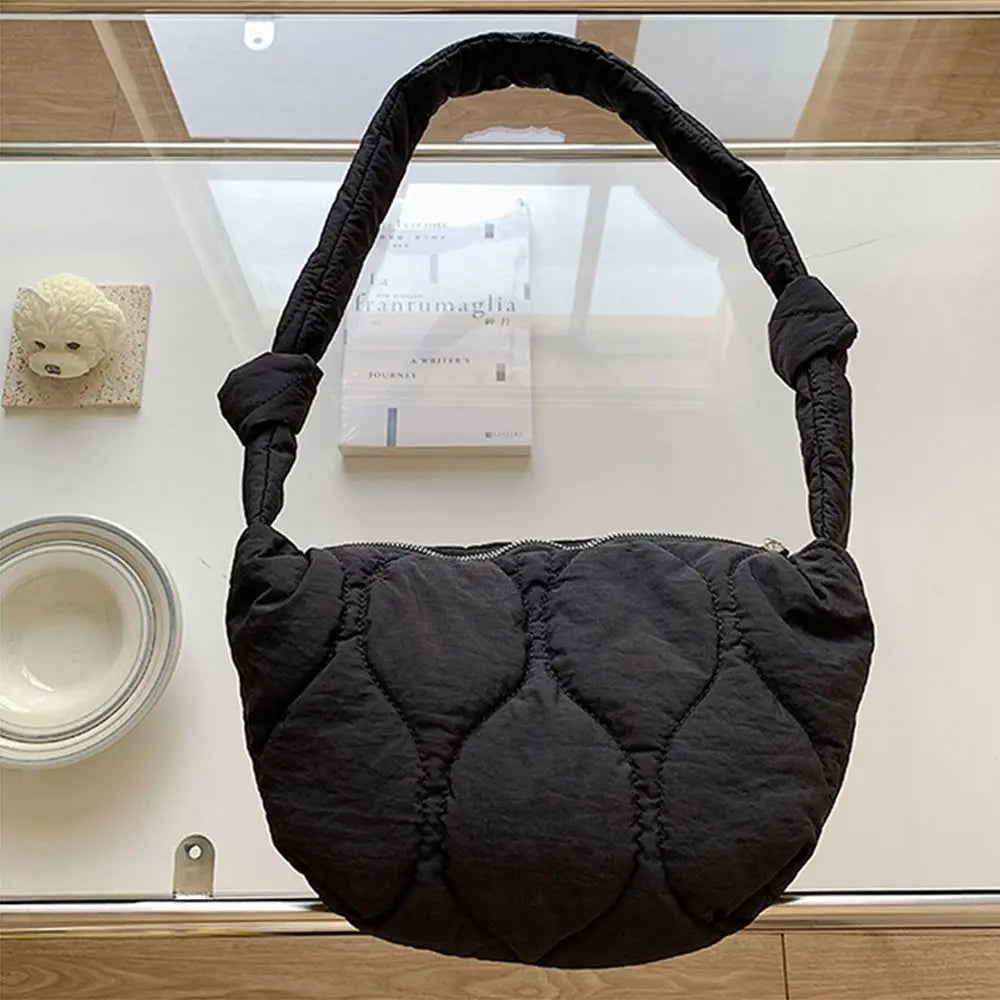 Stay organized and stylish with this trendy quilted tote bag. Perfect for winter, this puffy handbag is lightweight and offers ample space for all your essentials.