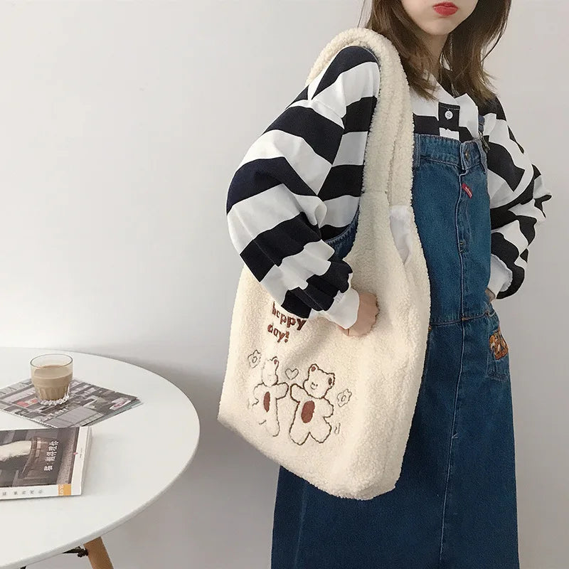 Women Plush Bear Embroidered Shoulder Tote Bag Canvas Fluffy Handbags