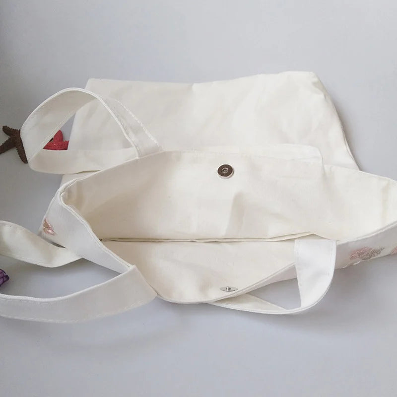 This shoulder bag features intricate lace floral embroidery, perfect for adding a touch of elegance to your outfit. Made of durable canvas material, it's ideal for everyday use. It serves as a casual luggage organizer or a stylish bookbag for students.