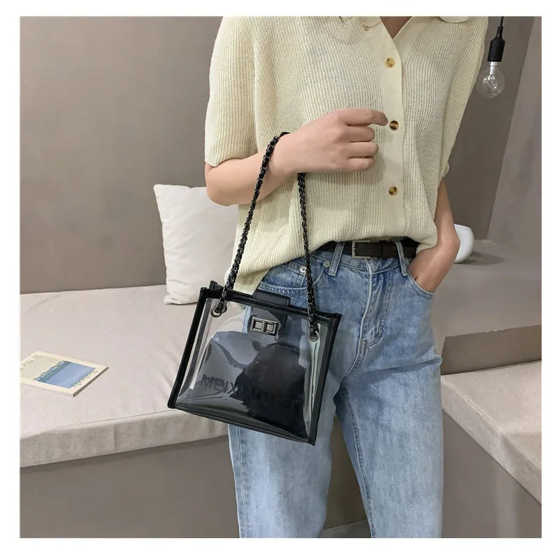 Elevate your style with this chic and trendy women's small shoulder bag. The transparent design and chain strap add a touch of sophistication to any outfit.