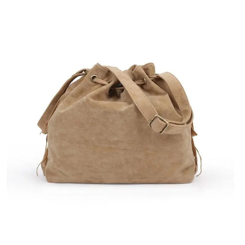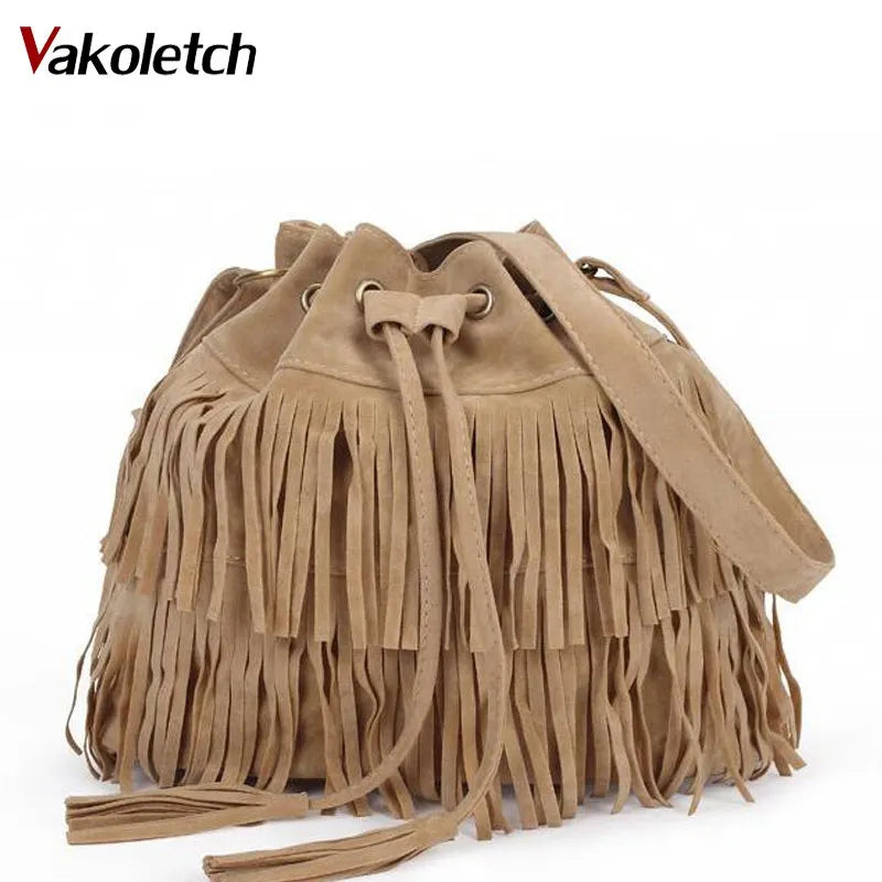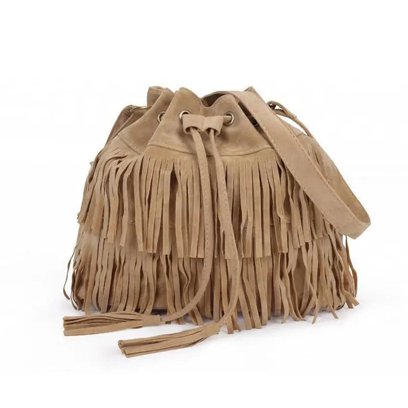 Women Suede Fringe Handbag Crossbody Tassel Purse Big Drawstring Sling