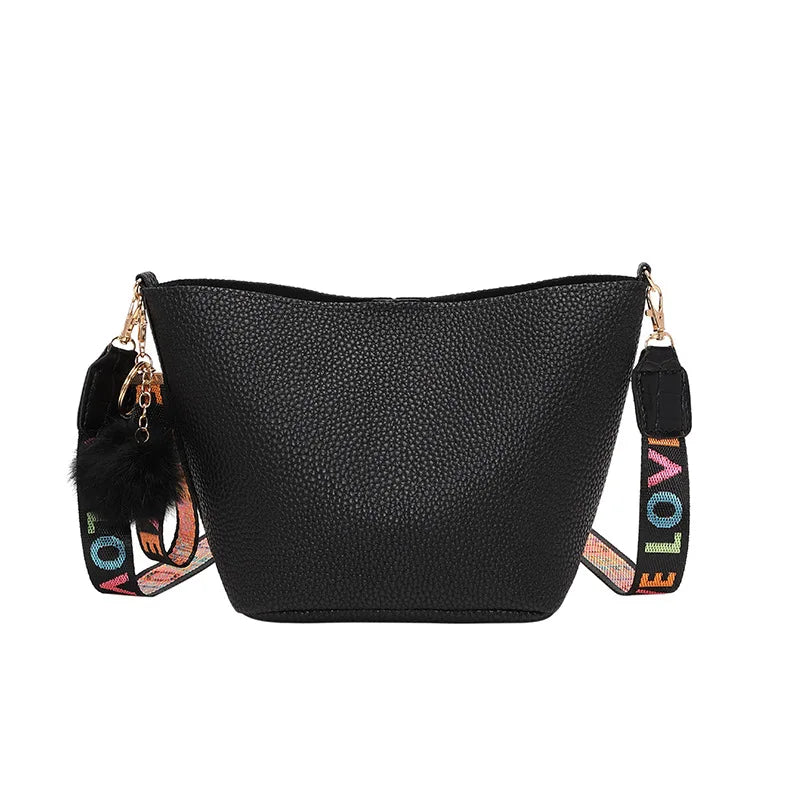 This female handbag features a tassel wool ball and a lychee pattern design, perfect for casual use. It is a solid shoulder bag that adds style to any outfit.
