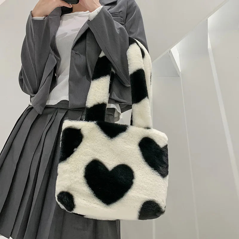 Stay stylish and cozy with this plush tote featuring heart prints. Perfect for the winter season.