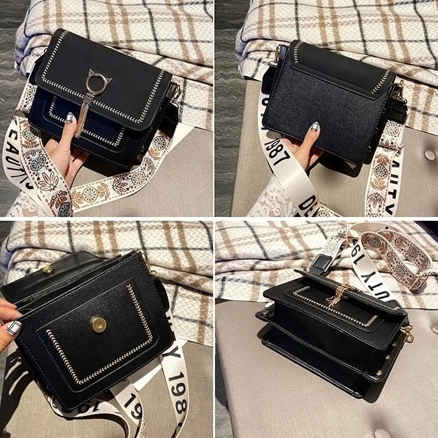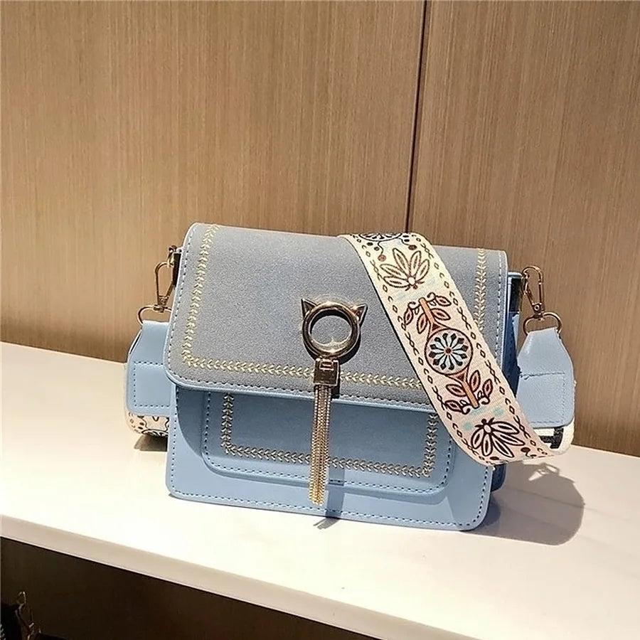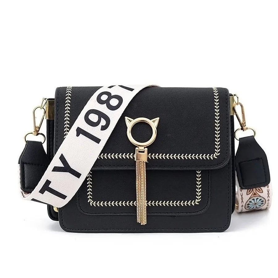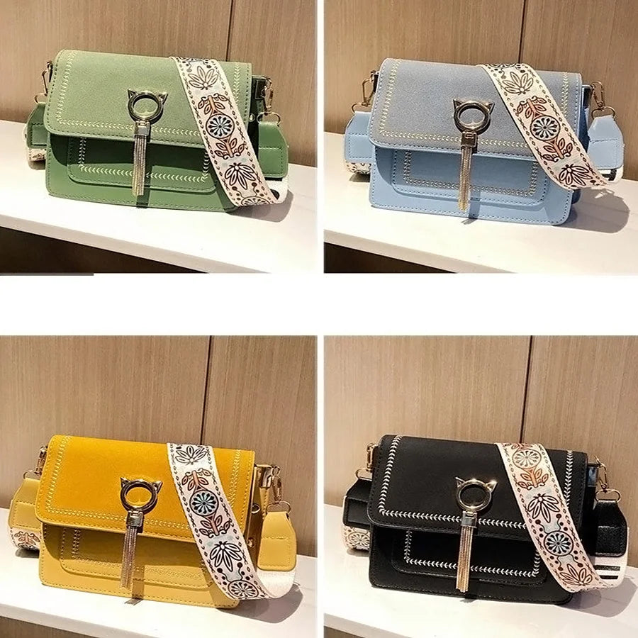 This small square bag is perfect for women on the go. It features a cute cat tassel design and a shoulder strap for easy carrying.