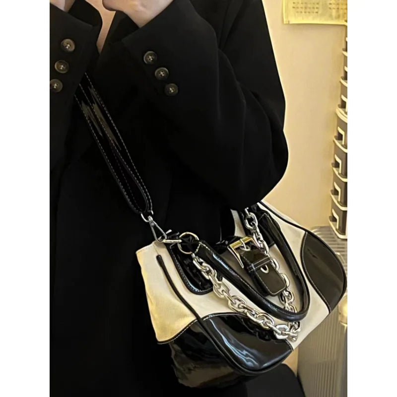 - Canvas splicing and patent leather chain design
