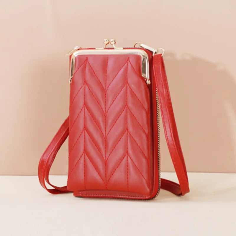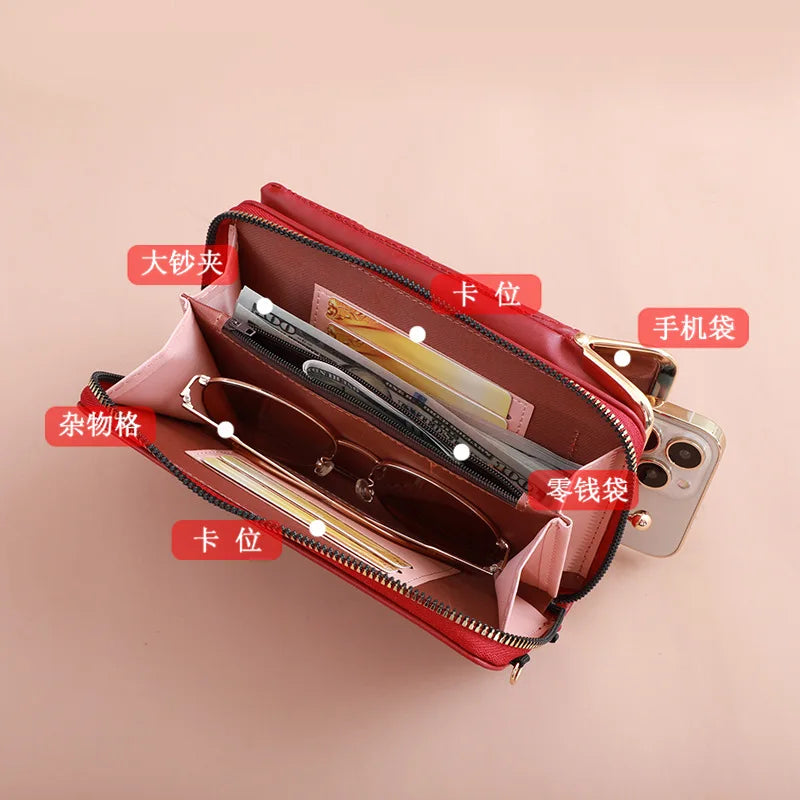 This shoulder bag is made of high-quality soft PU leather, perfect for women on the go. It features a clip phone pocket and is designed for convenience and style.