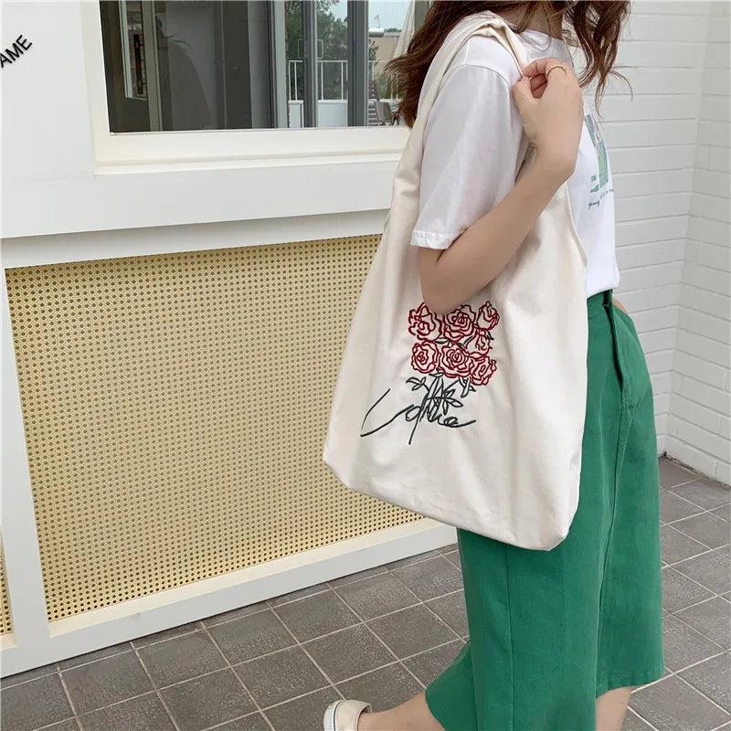 This stylish canvas tote bag features beautiful floral embroidery, making it a perfect accessory for any outfit. It offers a large capacity for shopping or everyday use.