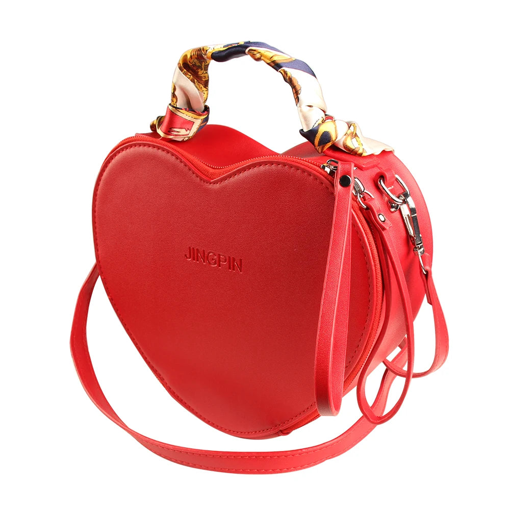 Elegant heart-shaped red tote shoulder bag made of premium leather material. Includes a stylish scarf accessory.
