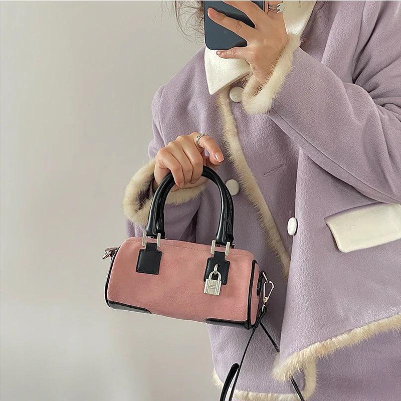 Women's Lock Cylinder Shoulder Bag Matte Leather Pink Clutch Handbag