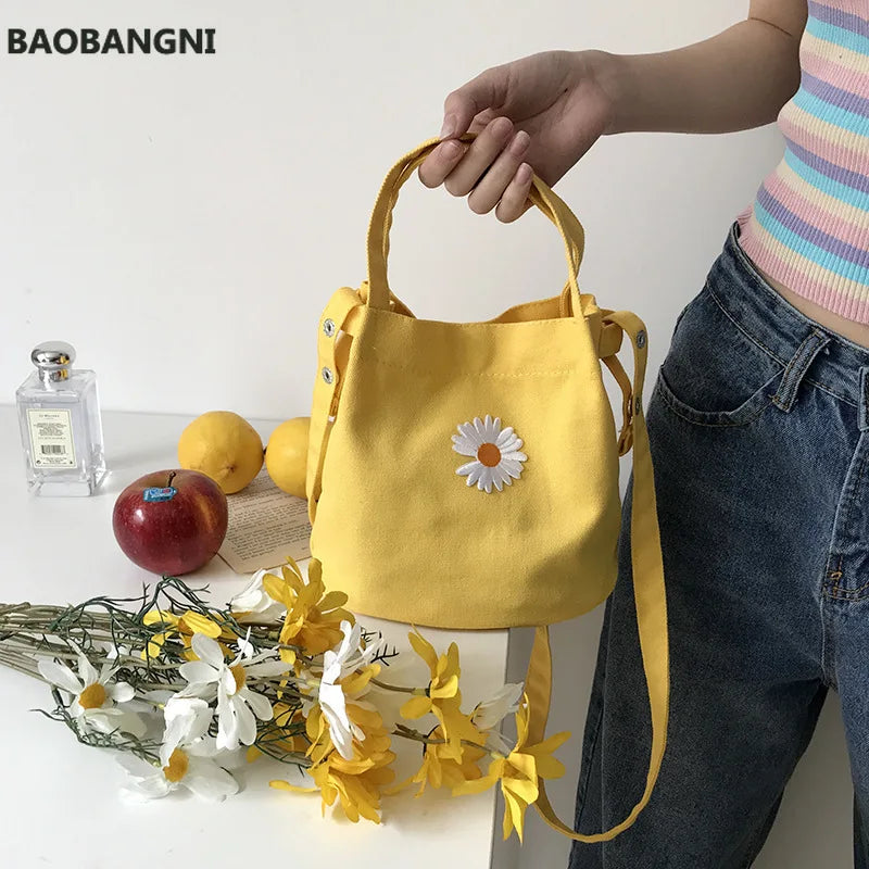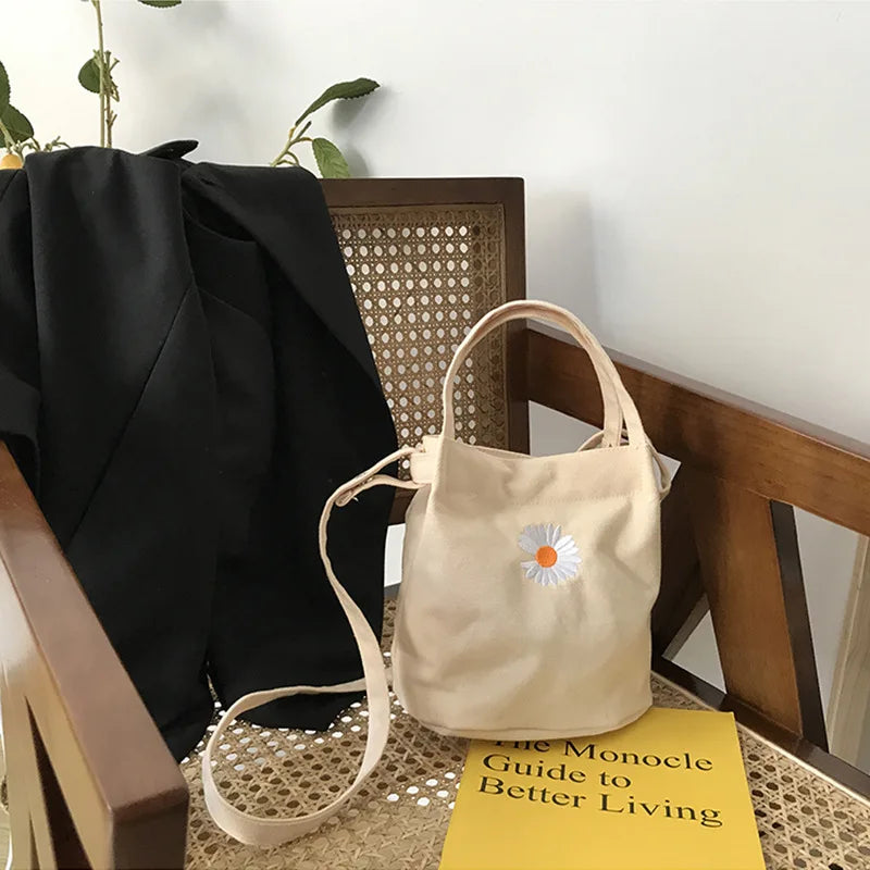 Stay stylish with this mini canvas shoulder bag featuring a daisy design. Perfect for casual outings, this small tote handbag offers a vintage touch to your look.