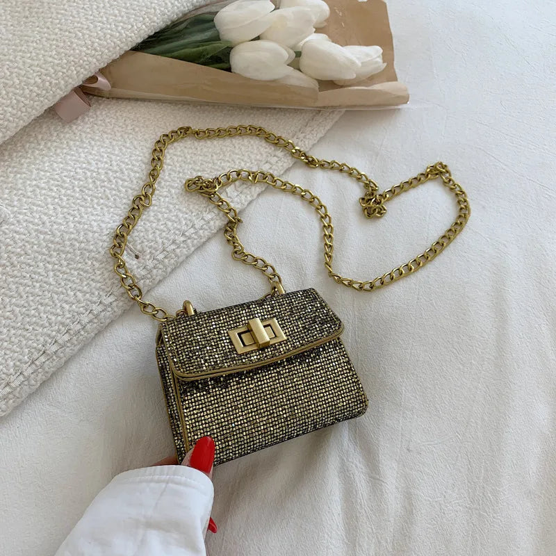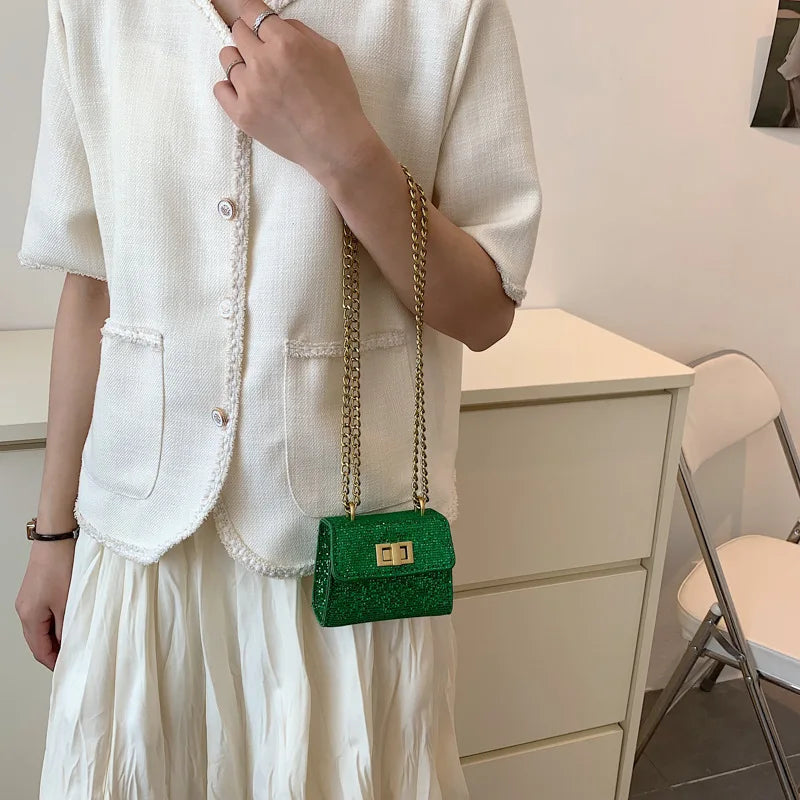 This small messenger bag is perfect for women who prefer compact and stylish accessories. It features a chain strap, sequin design, and can be worn as a shoulder bag or crossbody.