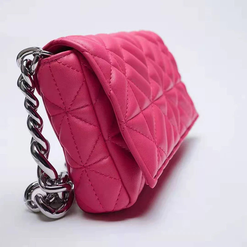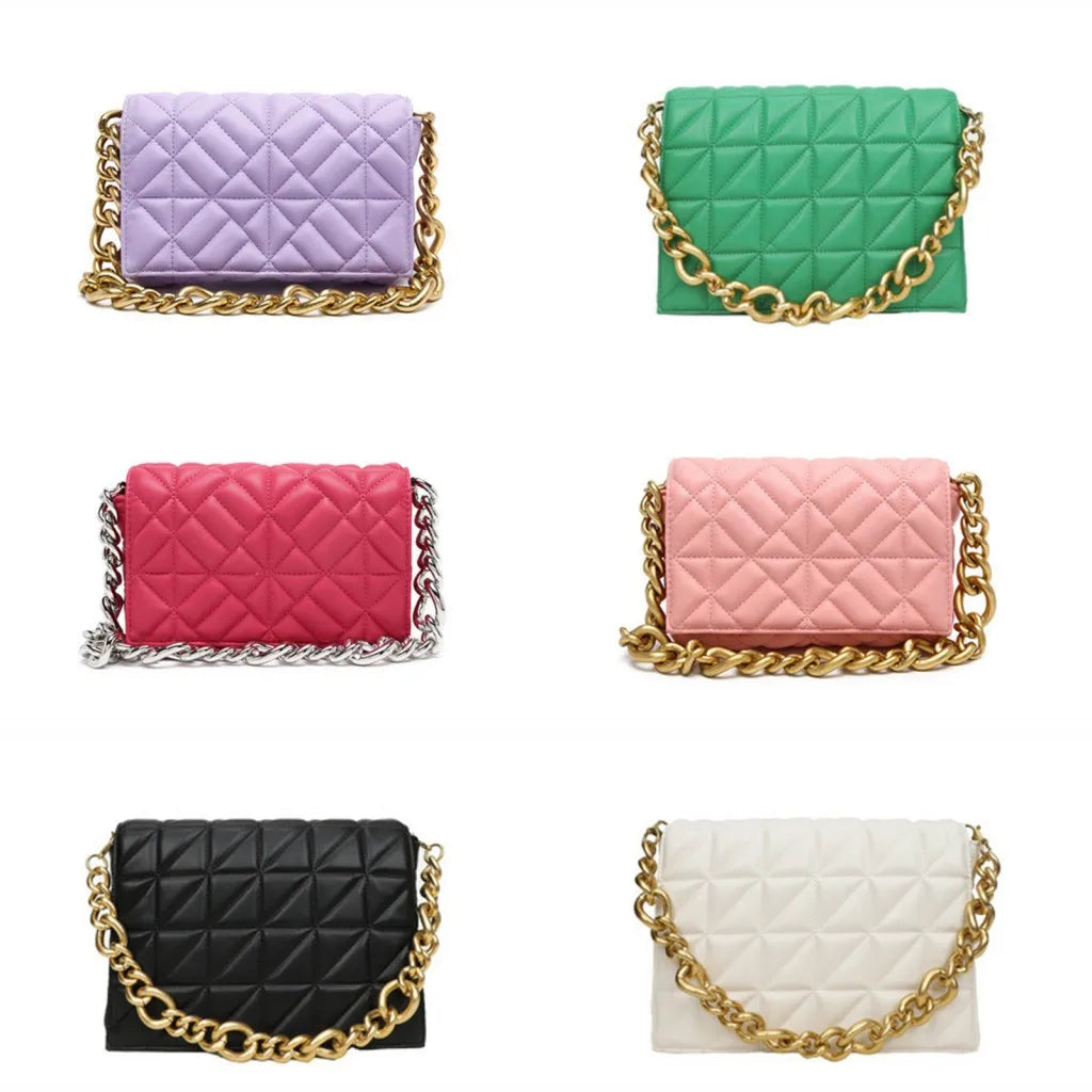 This stylish women's shoulder bag features a thick chain design and quilted pattern. It can be used as a purse, handbag, or clutch for a versatile look.