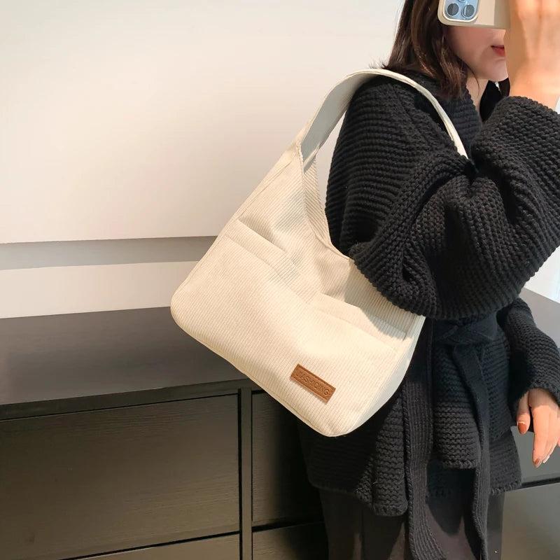 This underarm tote bag is perfect for casual outings. Made of soft corduroy, it offers a comfortable and stylish carrying option for women.