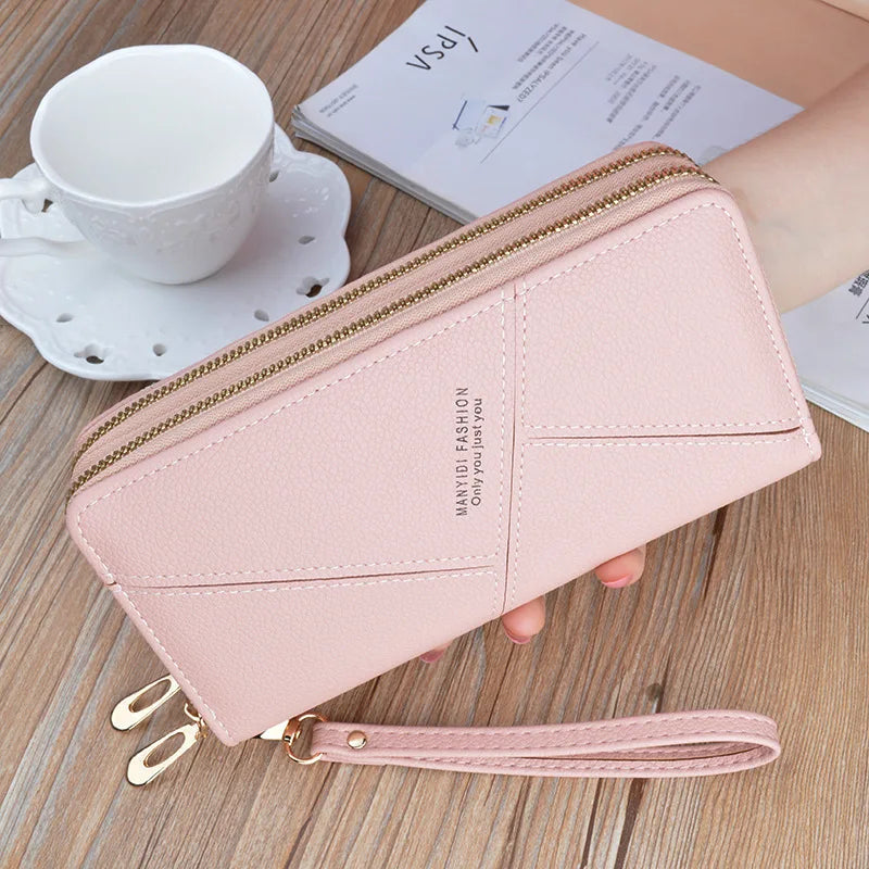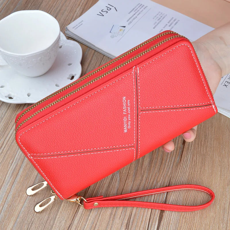 Women's Splicing Long Clutch Wallet Double Zipper Hand Strap Bag