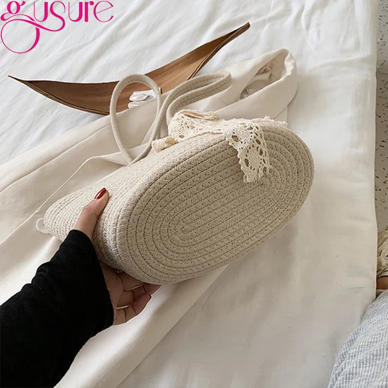 Women's Straw Woven Top-handle Handbag Vintage Ribbon Large Capacity
