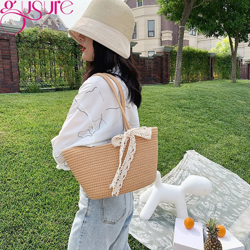 Stay stylish this summer with this casual straw handbag featuring a vintage ribbon design. Perfect accessory for underarm or shoulder wear.