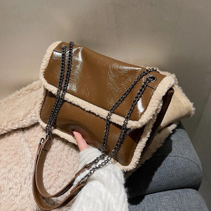 Stay stylish and organized with this versatile crossbody handbag. Made of high-quality wool and leather materials, this bag is perfect for everyday use. It features a chain strap and can be worn as a shoulder bag or messenger bag.
