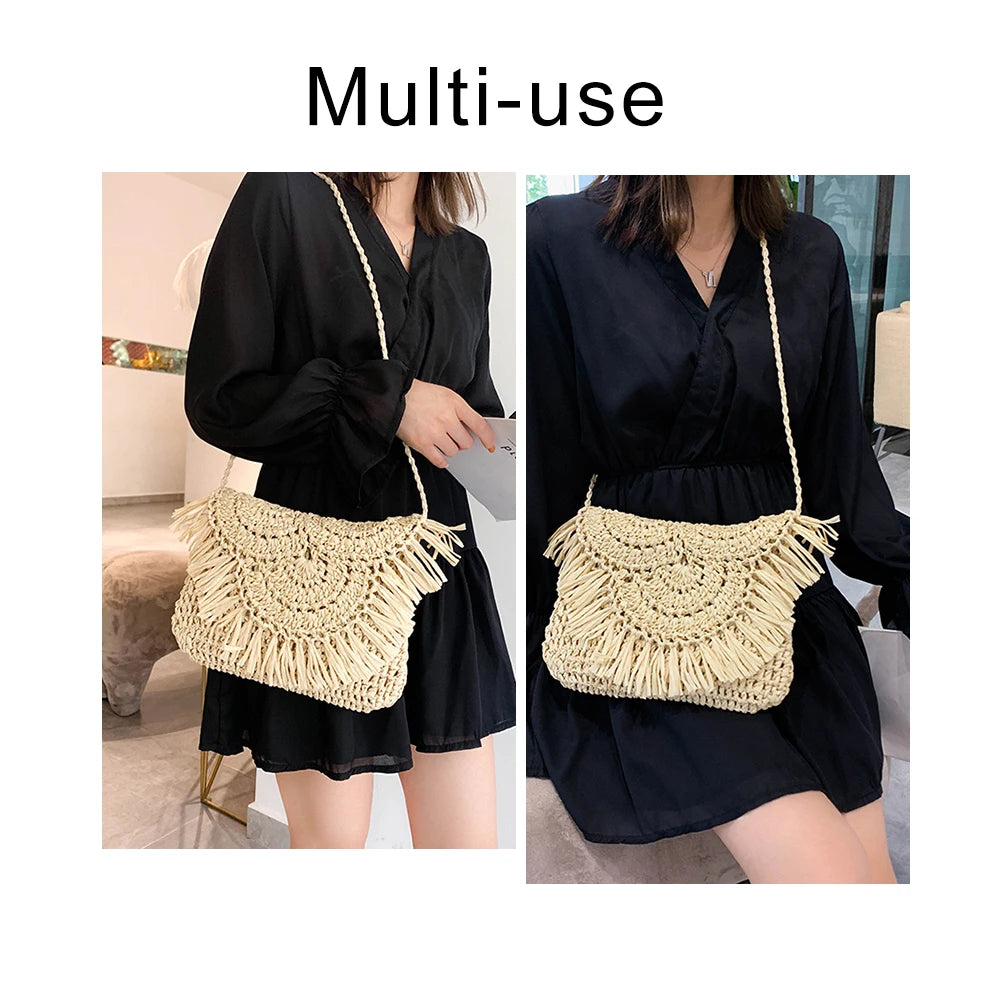 This bohemian-style handbag is perfect for a day at the beach or a shopping trip. Made of woven raffia straw, it's lightweight and stylish. The crossbody design makes it easy to carry, while the clutch option adds versatility.
