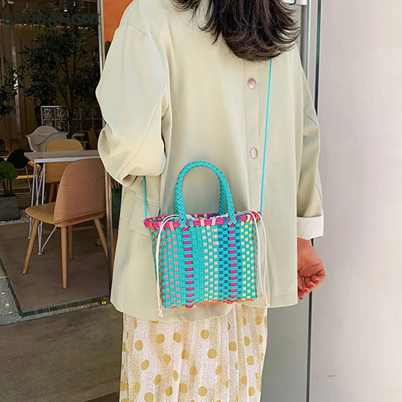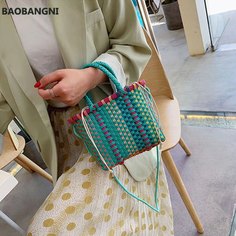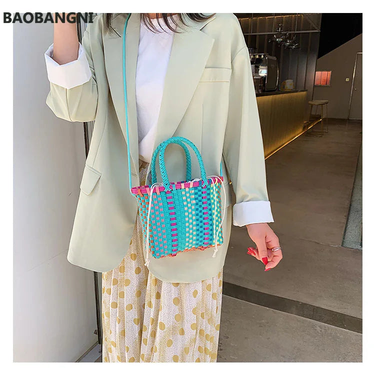 This small handbag is perfect for a day at the beach or shopping. Made of high-quality plastic woven rattan straw, it is durable and stylish.