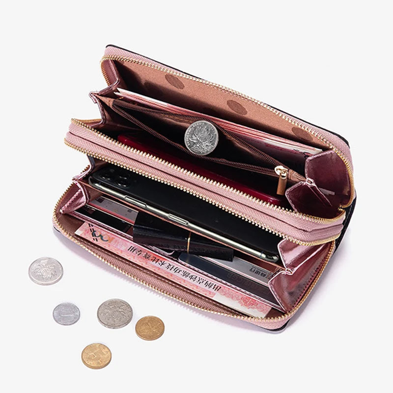 Stay organized with this stylish and spacious women's wallet that features a zipper closure. It has ample room for your essential items like cards, cash, and a mobile phone. Made of high-quality leather, this wallet is durable and functional, making it perfect for everyday use.