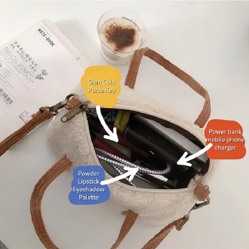 This adorable Bear Women Boston Bag is made of woolen corduroy material with a plush design. It features a small handbag design, ideal for girls. The bag has a cloth zipper purse and can be worn as a shoulder bag or crossbody bag.