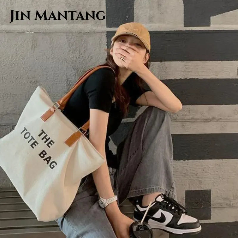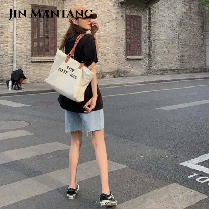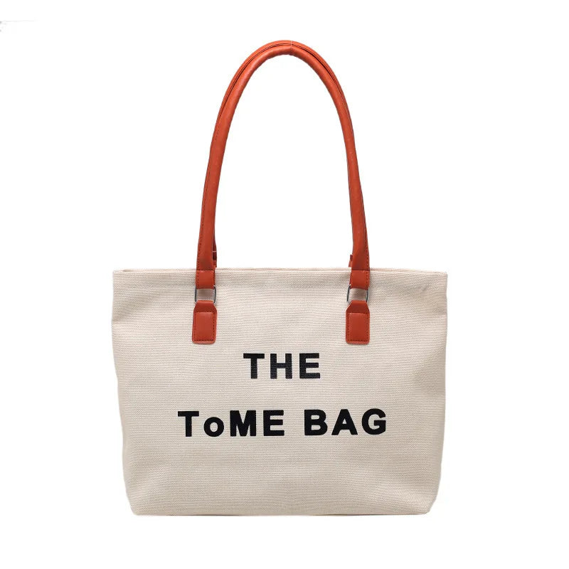 This canvas tote handbag is perfect for casual outings. It features a stylish letter design and can be worn as a shoulder or crossbody bag.