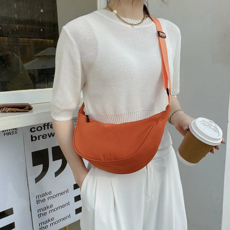 This solid nylon hobo bag is perfect for women on the go. It offers a spacious design and can be worn as a shoulder or crossbody bag. The half-moon shape adds a stylish touch to your outfit.