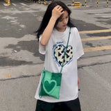 Heart-shaped collage bag with a unique design, perfect for casual outings.