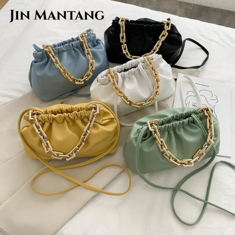 This stylish underarm shoulder bag features a pleated pouch design with a dumpling clip for closure. It comes with thick chains for added charm and convenience.