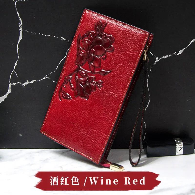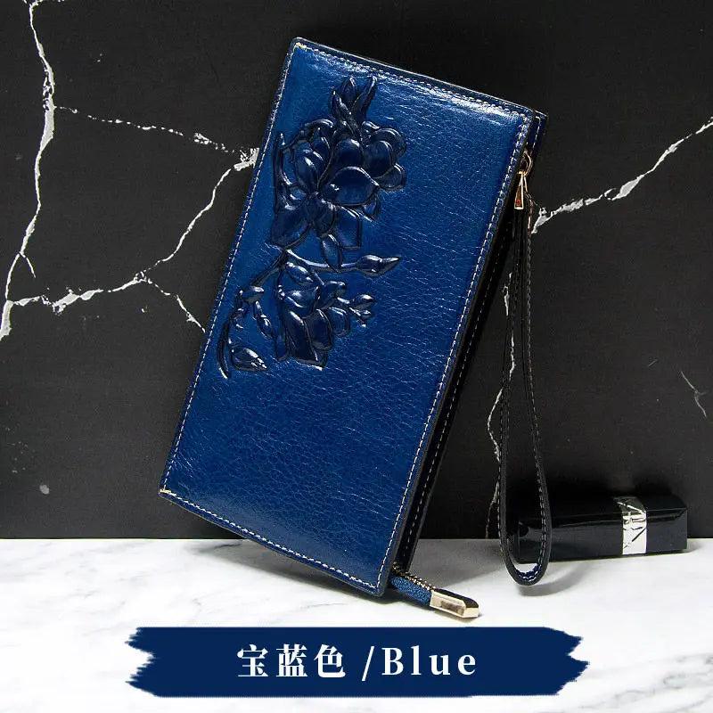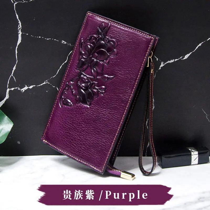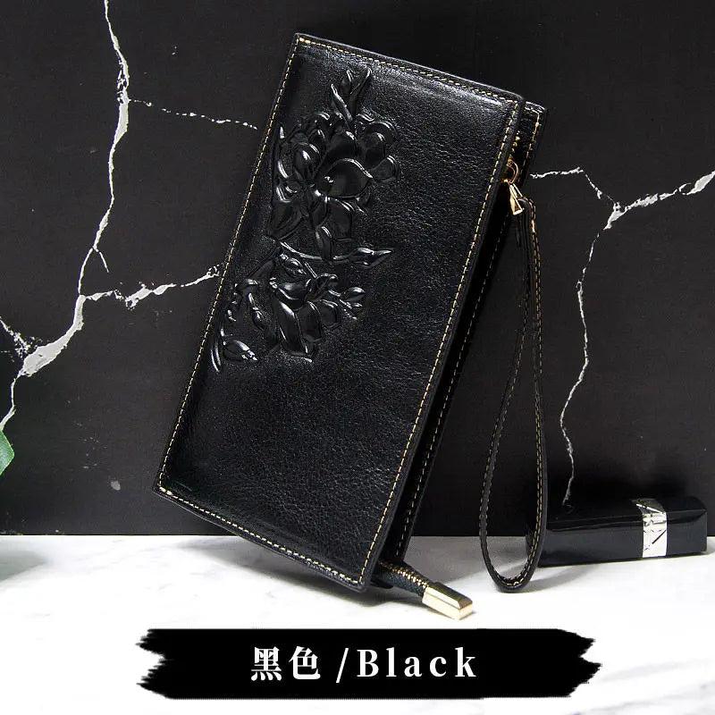 This clutch bag is made of first layer cowhide with an embossed design. It is oil-proof and durable, perfect for storing coins and cards. The thin and long design adds a stylish touch to your outfit.