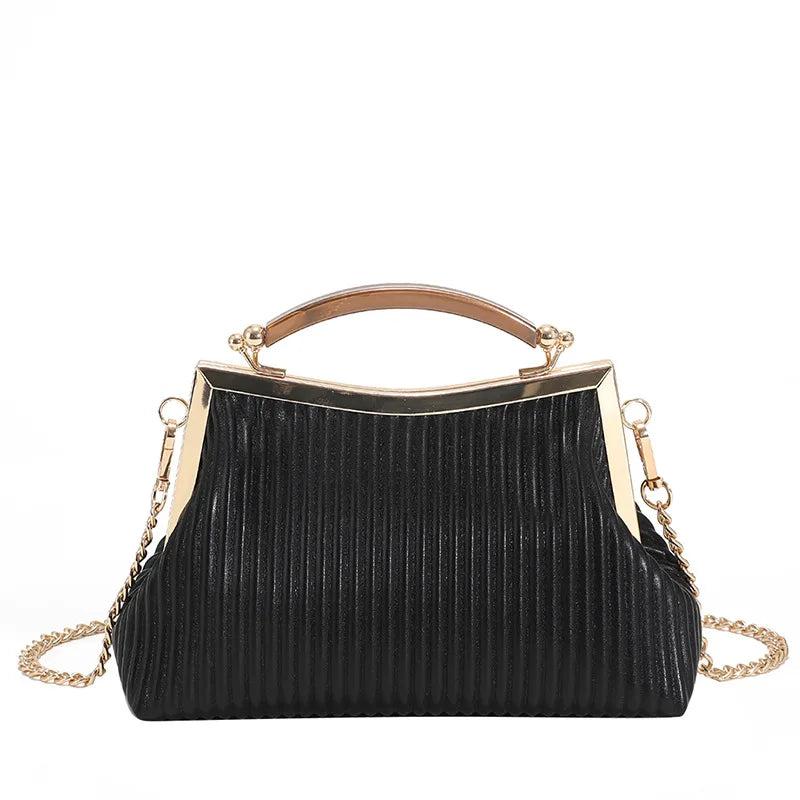 Fashion Metal Handle Ladies Handbag Chain Shoulder Bag Stripe Pleated Square Cro