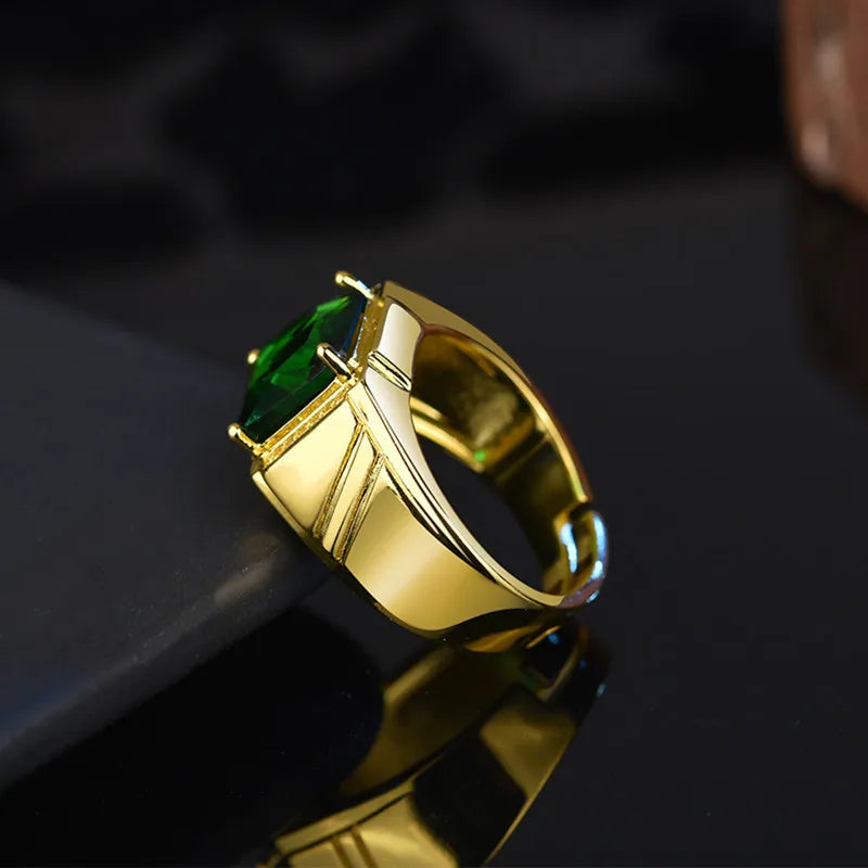 This masculine green crystal ring features emerald gemstones set in 18k filled material. Perfect for adding a touch of elegance to any outfit.