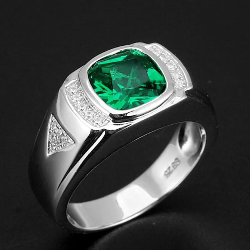 Green Emerald Crystal Diamond Rings for Men 18k Silver Jewelry