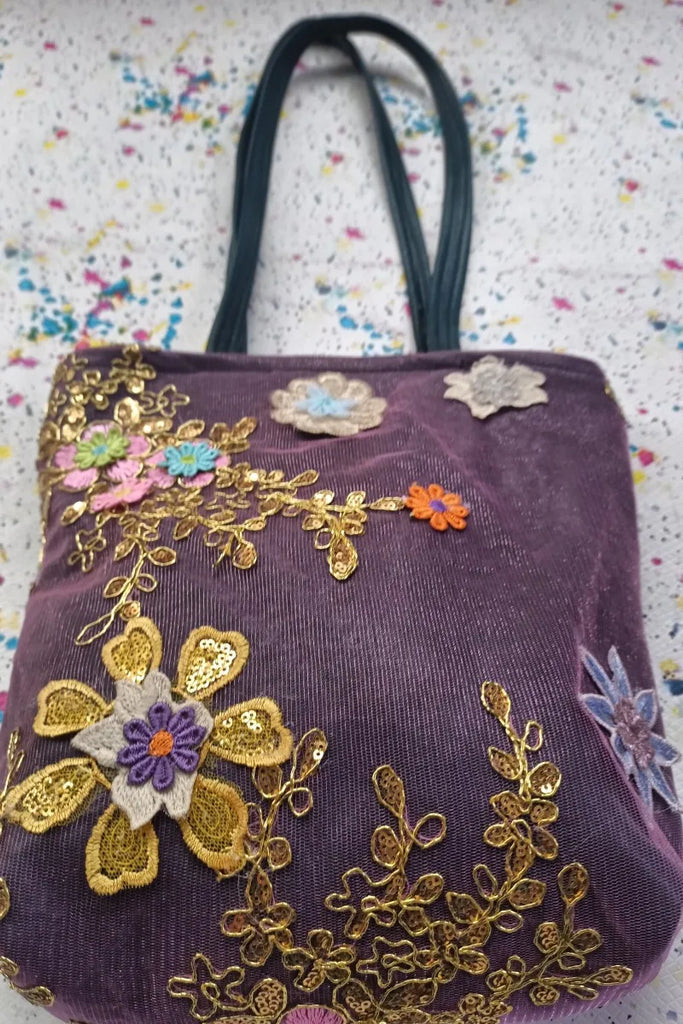 This stylish shopping bag is made of leather cowhide featuring three-dimensional sequins and multi-layer embroidery. Perfect for carrying your essentials in style.