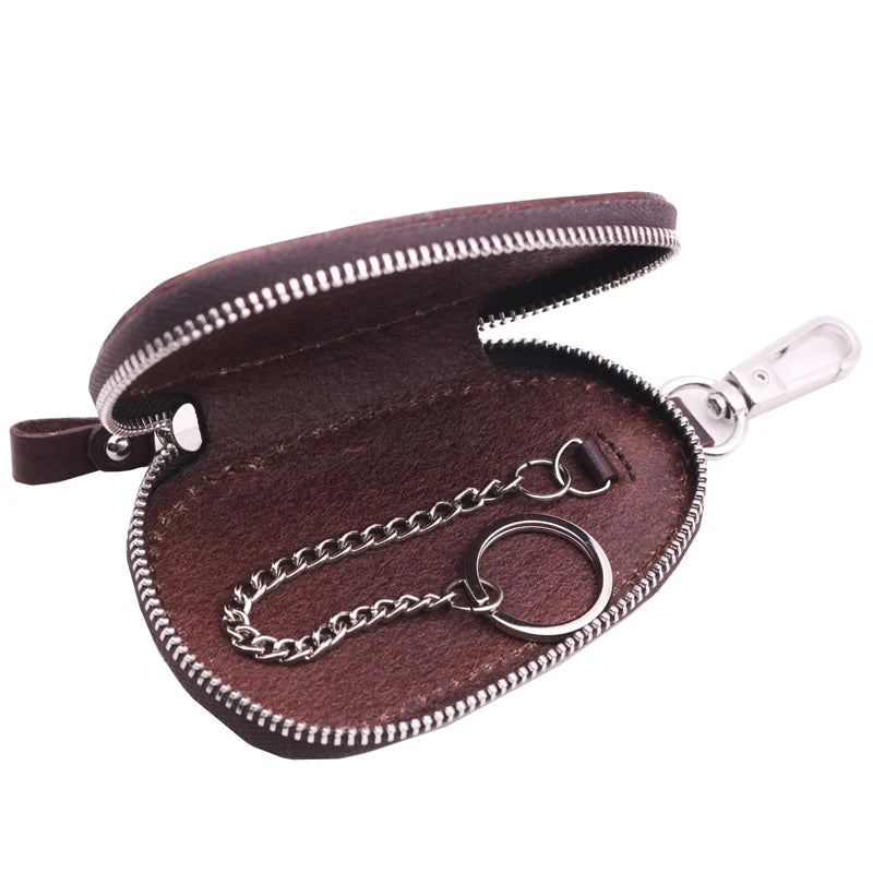 Keep your keys organized and easily accessible with this stylish 100% leather key holder. The zippered pouch provides a secure storage for keys.