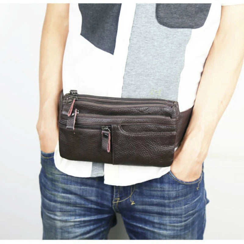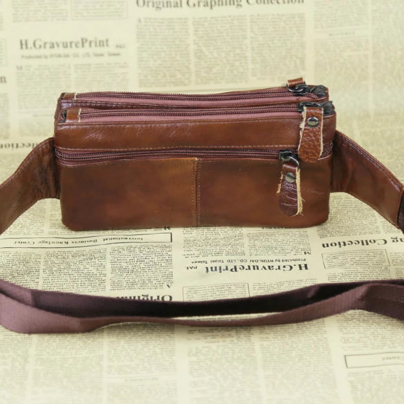 This men's leather waist bag is made of cow leather and can hold a 6-inch phone, change, and other essentials. It features a vintage design and can be worn as a chest bag or fanny pack.