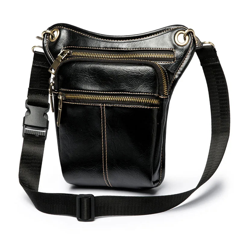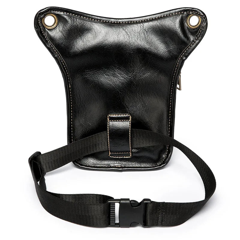 This versatile leather waist pack is perfect for men on the go. It can be worn as a drop leg fanny pack, thigh belt, hip bag, or bum bag. Ideal for motorcycle riders and outdoor enthusiasts.